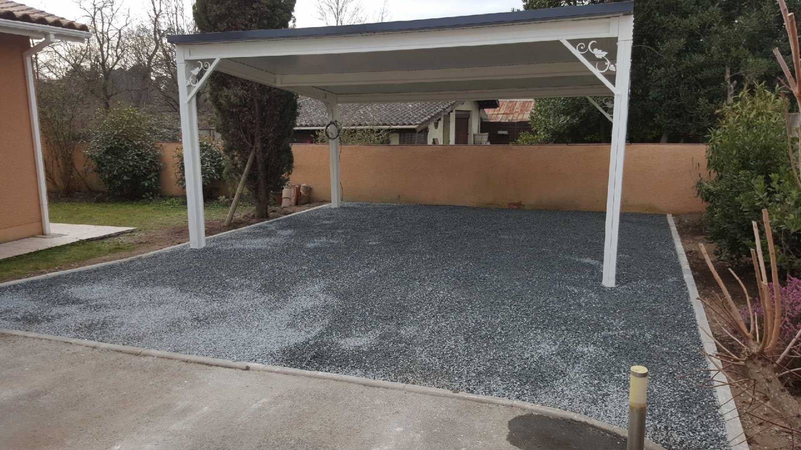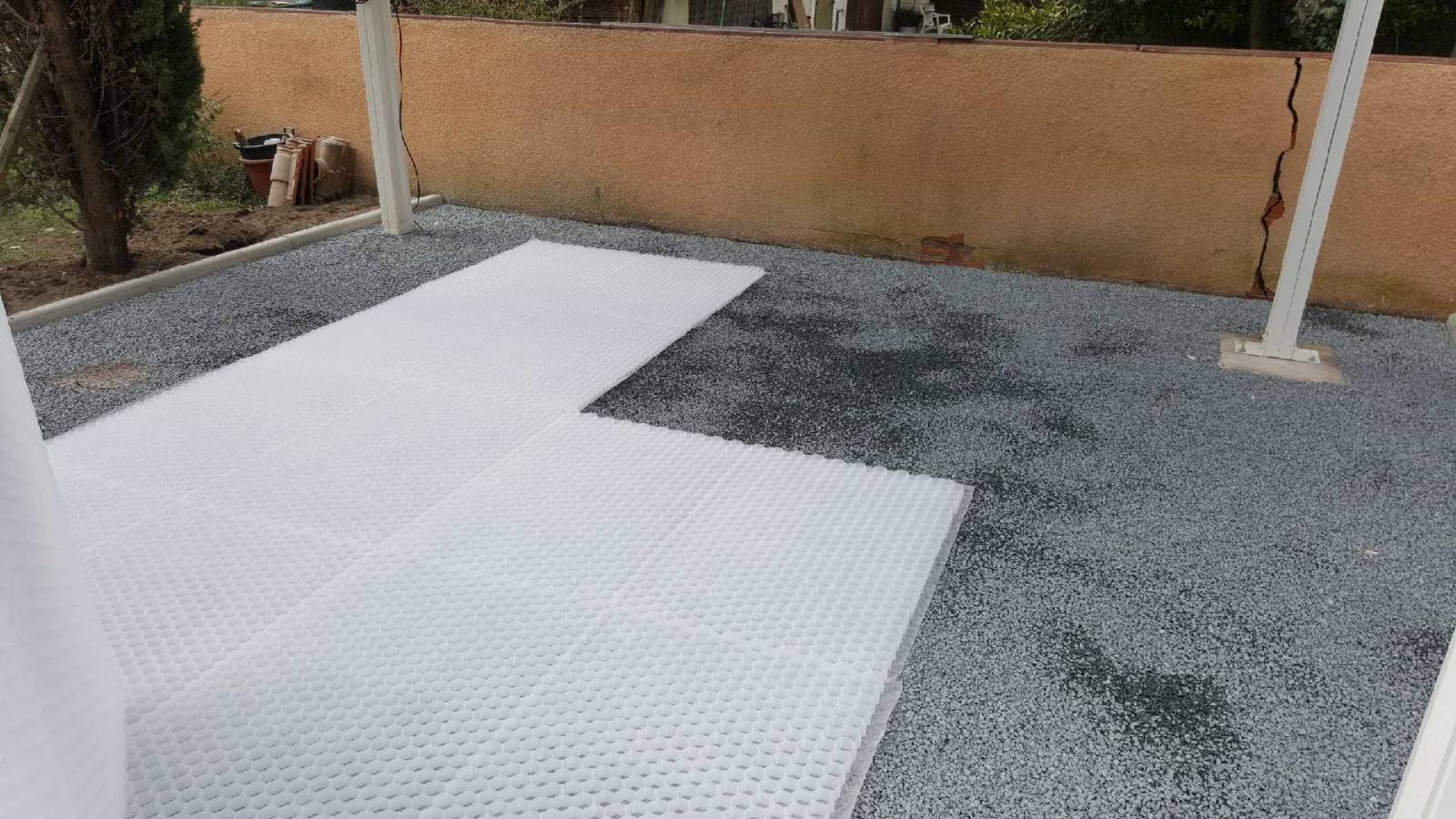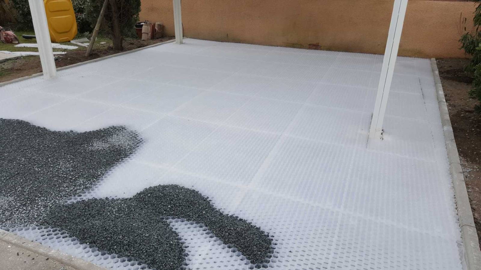 Nous avons réalisé ce chantier sur la gironde nous avons utilisé des dalles hors sol . Le client été a la recherche d'un support esthétique ,perméable et solide pour pouvoir garer son véhicule a l'abris. Nous lui avons proposé la solution de dalle hors sol avec la pose de plaques alvéolé de type NIDAGRAVEL.