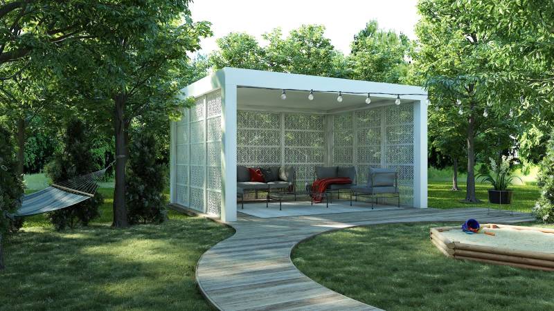 Image illustration : Pergola aluminium sur-mesure coloris blanc décor sérigraphié pépites by Cadiou.