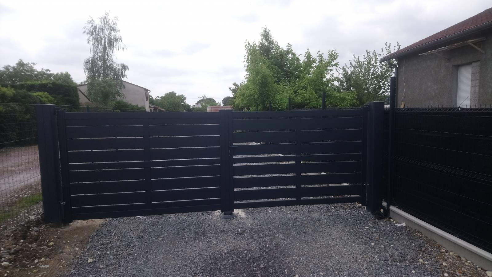 Ce modèle est ajouré et d un style moderne ,le ral est 7016 couleur gris anthracite Nous l avons plu tard motorisé a l aide de bras articulé avec une ouverture par télécommande bien pratique lorsque le temps est pluvieux ou lorsque l accès est proche de la route par rapport a la circulation .