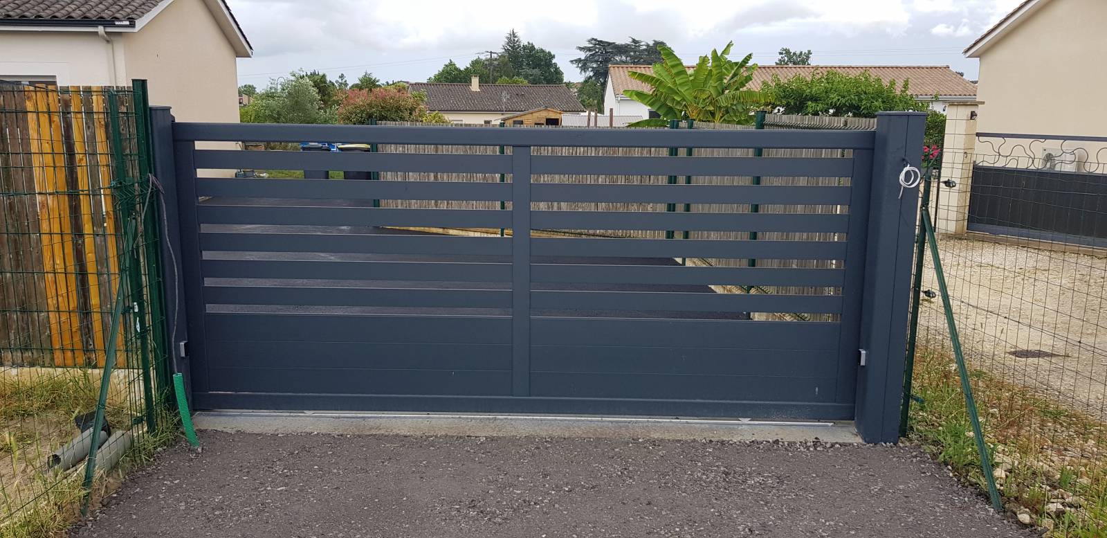 Trouver un installateur de portail coulissant automatique semi-plein avec portillon gris anthracite Saint André de Cubzac près de Libourne